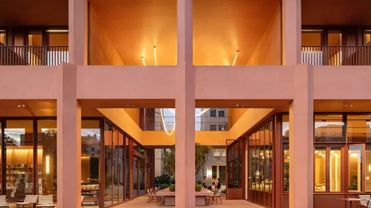 Organised across four levels, the ground floor operates as an openly accessible public realm, housing a bookstore, café, and light dining spaces. Above, Levels 2 to 4 accommodate 18 guestrooms oriented toward river views. A defining feature of the building is the continuous colonnade that wraps the structure, formed not by solid walls but by a series of polygonal columns. This semi-outdoor layer dissolves clear boundaries between inside and outside, creating a porous threshold that invites movement, air, and light through the building.