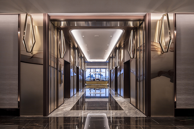 The islands and water becomes the theme of a series of art installations that link the hotel arrival area, the main lobby and the reception. Upon arrival, guests are greeted by a large landscape art piece in the auto court called “3 Islands”. Abstract crystal and metal cutouts in mountain shapes symbolize Zhuhai, Macau and Hong Kong, and are placed among lush trees and planting to form a 3 dimensional landscape composition. Upon entering the lobby, a large 10m tall mural wall becomes the focus, depicting an aerial view of 28 silver islands floating on a transparent sea of mirror and metal weaving. This dramatic installation combines serenity and drama, carefully incorporates lighting to set mood effects for day time and night scene. Upon arrival at the reception desk, a 3rd set of art installation composed of crystal islands can be seen floating on a water surface behind the reception. The water and the crystal islands connects visually to the beautiful scenery of the ocean and islands immediate behind the reception area.