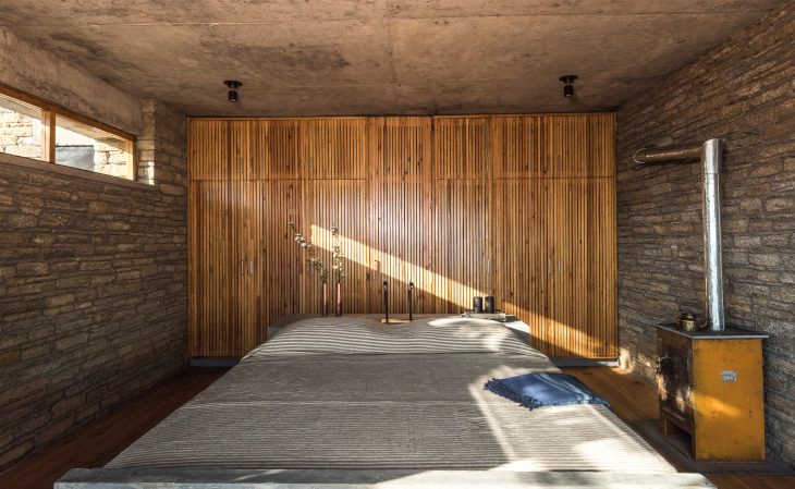 Local Pinewood was used extensively, from floor finish to doors and windows. Even the furniture was designed and made on site. The local craftsmen were used to make copper and stone accessories for the chalets. Almora has a fine tradition of weaving and all woollen fabric for bedding and furnishings were custom designed and produced locally. The overall finish is one of rustic simplicity, highlighting the local materials. The concrete soffits are kept unplastered, so are the fly ash walls finished with just a coat of paint inside. In the chalets, a bed, table and seat was designed as an island unit and was finished in smooth cement render. The toilet walls are finished in ‘kadappah’ a black stone cut into tiles.