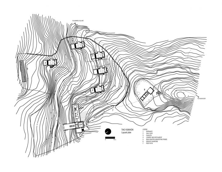 From the architects: This is a small hotel in Uttarakhand, India. Situated 1600m above sea level in the village of Kaser devi near the town of Almora. Its named after the region it is situated, ‘kumaon’ a region of mountains, valleys, forests and scenic lakes. Access to the site is via a slightly steep track down, off the main road. This village road stops about 250 metres from the site and the rest of the way is through a narrow village walking the track to the site. You are met at this point by the hotel staff relieving of your bag and baggage, making the rest of your walk to the hotel quite pleasant. You also have the option of making the short trek by a pony as well.