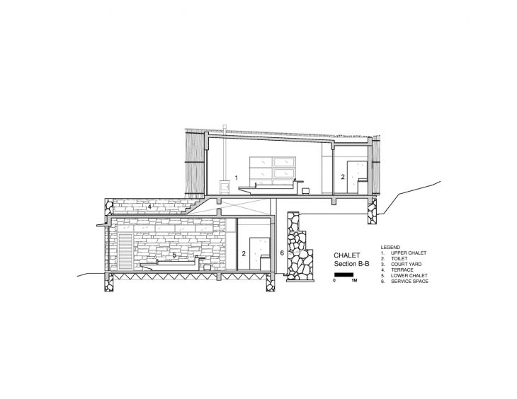 The sloping site is terraced which is typical of agricultural plots in this area and is in two parts a small half-acre plot at the top of the site which we used to situate the service facilities, and a two-acre plot, separated by small strip of common land.what is special about the land is that it has uninterrupted views of the valley below and majestic views of the Indian Himalayas 300 km away. The programme included 10 rooms, lounge and dining facilities, library, spa and services. We decided to design the rooms in pairs, one atop the other and scatter them across the site at different levels. This was partly to reduce the bulk of the building and also to reduce the overall footprint of the development. The lower chalet was built out of stone quarried from nearby, while the upper chalet walls were built out of fly ash bricks and cladded with bamboo sticks to give a sense of lightness.