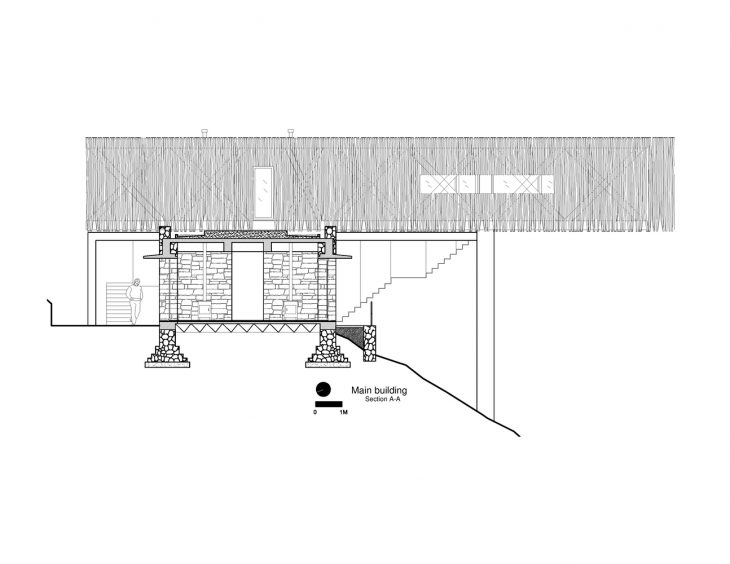 The main building was situated on the highest point in the site, the ground level is the main entry point which houses a lounge, library, and toilet and administrative facilities, while the first floor houses a dramatic steel cantilevered dining room, with an axis vista towards ‘nanda devi’ India’s second highest peak, hundreds of kilometers away. The roof of the lounge becomes a terrace for outdoor dining and yoga. Further, the three sides of the dining room were also cladded with bamboo sticks to reduce the visual impact of the bulky steel structure. The approach to the hotel is through a small gate from the footpath, and a walkway arches towards the main lounge, the first entry point for the visitor. A row of planted bamboo trees is used to cover the view of the chalets beyond and obscure the mountain views heightening the sense of expectation.