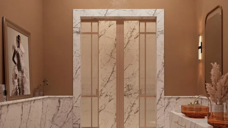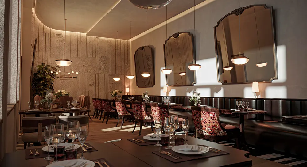Soft curves, sculptural forms, and warm tones respond to preserved facades and ornamental stonework. Limestone-inspired palettes, brushed brass, and muted shades reflect the city’s architectural character. Neo-classical motifs appear alongside bespoke Parisian furnishings dressed in textiles referencing Romanian culture.