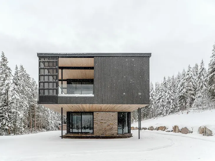 From the approach, the building settles within a framework of mature conifers. The upper level features vertical wood cladding that echoes the rhythm and tone of surrounding tree bark. At ground level, a natural stone base grounds the structure and strengthens the perception of the upper volume hovering lightly above the terrain.