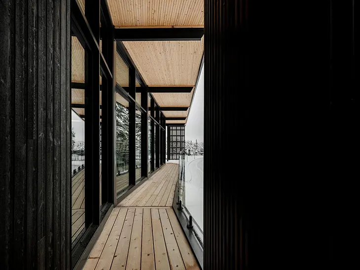 Wood decking defines the structural system. Its load-bearing capacity and slender profile allow the roofline to respond to orientation and views without compromising formal consistency. Beneath the roof, a continuous clerestory glazing band wraps around the building. This glazing preserves an uninterrupted connection to sky and forest, enhancing the sensation of a floating roof plane above the living spaces.