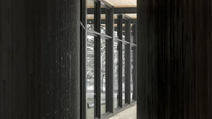 Wood decking defines the structural system. Its load-bearing capacity and slender profile allow the roofline to respond to orientation and views without compromising formal consistency. Beneath the roof, a continuous clerestory glazing band wraps around the building. This glazing preserves an uninterrupted connection to sky and forest, enhancing the sensation of a floating roof plane above the living spaces.