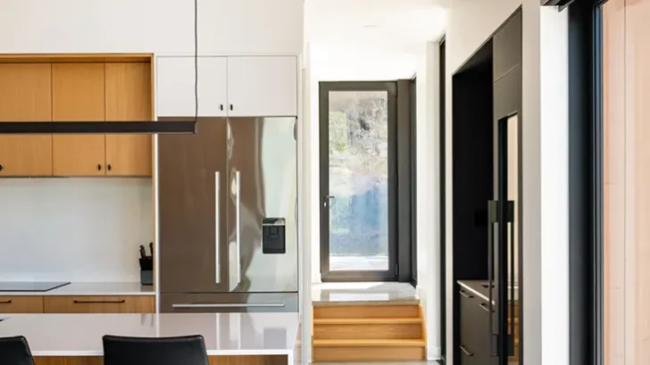 Perched on a steep site above Lake Fournelle in Saint-Hippolyte, Intervalle by Atelier BOOM-TOWN turns topographical constraint into design intention. The residence stretches across two levels that follow the natural slope, transforming elevation into experience. Through this calibrated descent, the architecture becomes an instrument of observation, framing shifting perspectives of the Laurentians with each step.