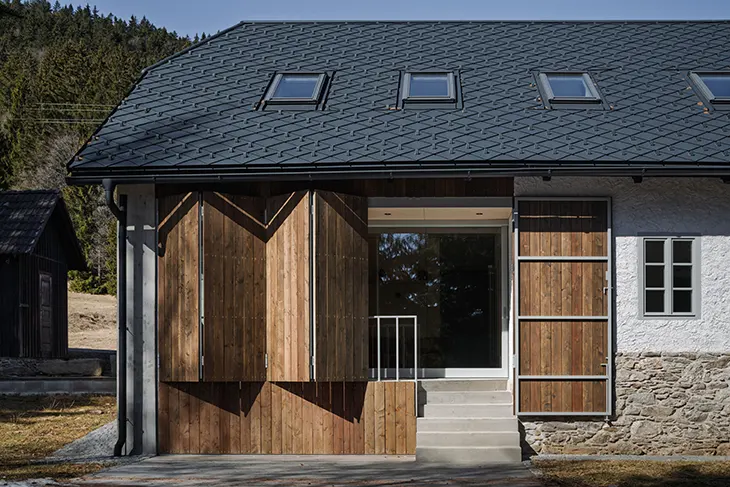 Studio Plyš introduced new glazing to bring daylight into the interior and frame views of the forest. Large shutters provide protection from harsh weather and maintain privacy when closed. The architects left structural elements such as shutter rails and exposed concrete visible, allowing the renovation to remain legible. This strategy acknowledges the presence of new construction while maintaining continuity with the building’s historical character.