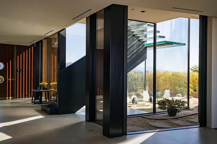 Outdoor living is embedded in the overall layout. Terraces extend from the main interior spaces, offering stepped landscapes that open toward the city. A swimming pool and open-air lounges form part of this sequence, supporting the relaxed nature of Southern California living while preserving the architectural calm of the residence. The garden design works in tandem with the structure, softening edges and reinforcing the sense of place.