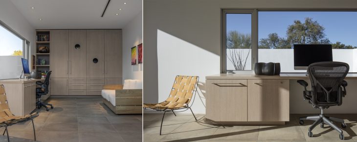 The courtyards, and the boundaries they define, also serve a programmatic role: to “zone” the house for the clients’ eleven rescue cats. Feline accommodation extends to the design of cabinetry, which incorporates a variety of hiding and play spaces. The Courtyards House also serves as a gallery for the clients’ collection of paintings and photographs by Tucson artists. In many cases, the colors and compositions of the individual art pieces are complimented by the adjacent xeriscapes, or through the home’s architectural play of light-and- shadow. The white interior and exterior walls act as a canvas for registering temporal atmospheres – the subtleties and contrasts imbued by the desert sky throughout the day and night.