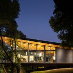 The bedroom wing and the services and barbeque wing are the two wings of this enormous prism that is punctured by the center courtyard. The playroom/gym, the library, and the double-height living room are all articulated by these arms, which provide height to the main living area of the house.