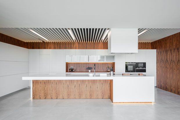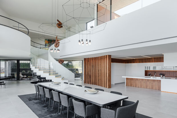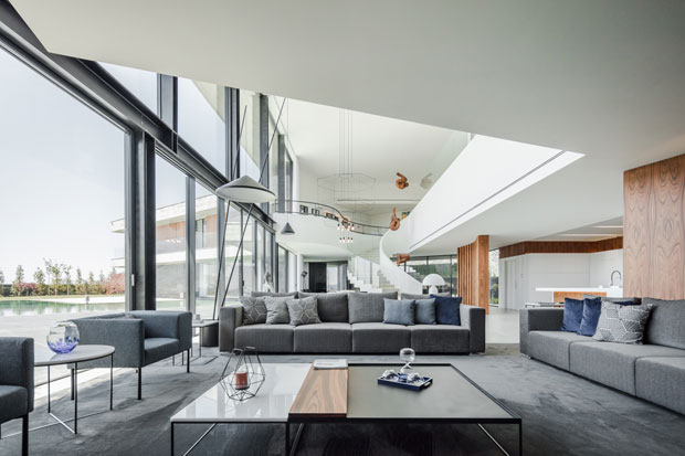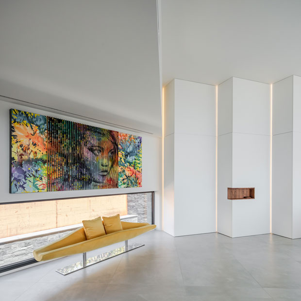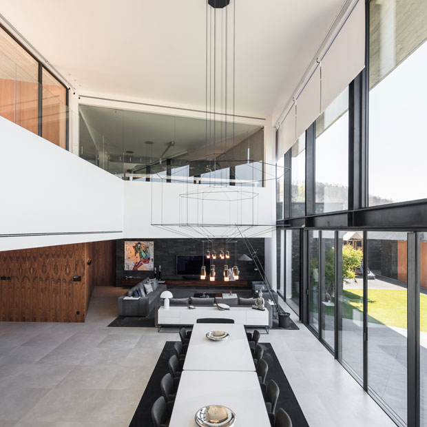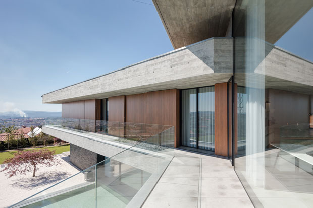 The main idea was to develop a project that can trigger emotions as the client walks through the house, providing in each moment new points of interest and comfort sensation.The main entrance is done through a porch, in which a large window, allows to take a glimpse on the interior of the house, through the large double height area, displaying the living room in the lower floor and the view over the city. – from the architects