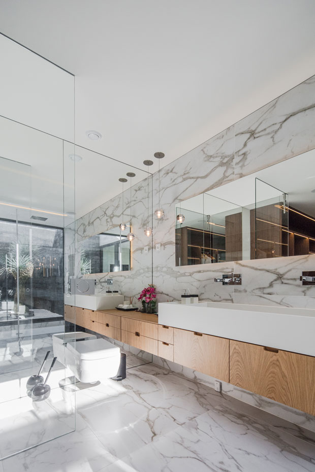 One of the key concerns was to create a fluid and permeable housing concept, without the loss of privacy. For that reason, it was developed a central body to host the social area, and two rows for the more private functions, creating a “V” shape with arms focusing the sights over the city. Due to the site’s slope, the house was develop to articulate an entry floor at street level with a lower floor, where the living room connects entirely with the garden and the swimming pool. That has allowed to create a very discreet entrance with a fast access to the ground floor, without evidencing the 930.00 square meters that form the house.