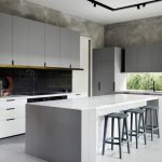 The house is situated on level ground and consists of three main axially symmetrical rectangular blocks. By its situation and shape, the house deliberately splits the garden into several parts: front garden open to public view, back private garden and small atria – each such garden space can be designed in a different style. Despite the corner plot, the spatial layout affords the family a good level of privacy. The central block of two floors houses the main garden-facing living space and corridors connect it with the ground-floor wings – one housing the leisure and spa facilities and one for the twin garage. The house façade is plastered, simple and the blocks are finished in white, grey and black colour gradation. The roofs are covered with vegetation, which further integrates the structure into its surroundings. The interiors are minimalist; floors and ceilings are made of architectural concrete. The walls are plastered white. There is a minimum of furniture with interesting accents such as open fire or a stone inserted as a shelf for a Japanese vase. The whole house is to reflect the investor’s unpretentious yet highly sophisticated style and a sense of balance, serenity and harmony. – from the architects