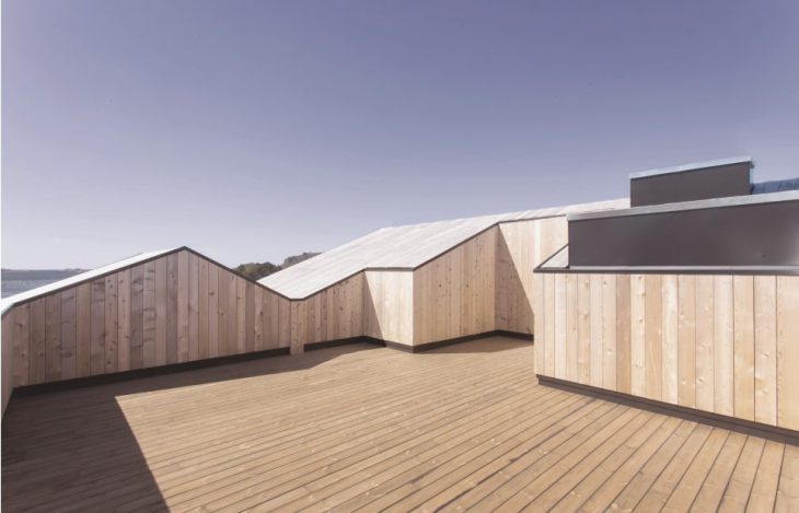 From the architects: The “Slippen” housing complex is located in the district of Lower Malmø, at the exit of Mandalselva in the Mannefjord. The town of Mandal has some very special qualities with its location where the river meets the sea, and a stunningly beautiful timber architecture. Lower Malmø on the eastern side of the river has historically been an industrial area, but this is currently under development and will in future become a vital part of Mandal’s vibrant city life. The project is iconic with its unique roof forms and minimal window details, while at the same time evoking the character of the local surroundings, taking its inspiration from the unique character of Mandal: the encounter between timber construction and the open sea. The architecture is steeped in local vernacular building traditions, but with a new and modern interpretation.