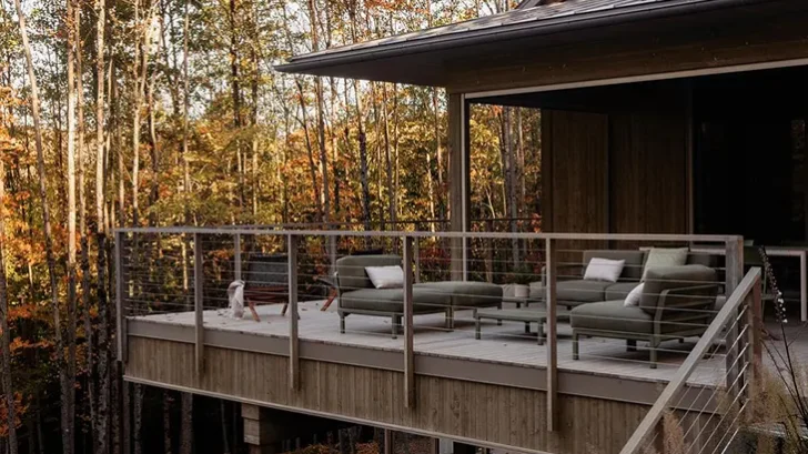 Set within a maple-wooded slope in North Hatley, Perchée by Matière Première Architecture positions itself as a calibrated response to terrain rather than an assertion upon it. The land descends gently toward a river valley, and the house follows that movement with restraint. Instead of clearing extensively or reshaping the ground, the architects suspend the structure along the slope, preserving the density and immersion of the forest as the site’s primary asset.