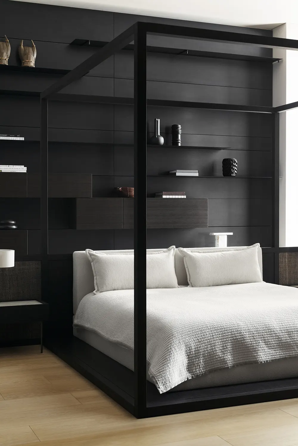 The private levels show this most convincingly. On the third floor, the dressing room for the heads of the family combines mirrored Storage modules with open compartments in ciliegio white and cuvée metal, creating a lighter and more reflective atmosphere. Nearby, Offshore sideboards in rosso cina stained ash and maple interiors act almost like sculptural anchors in the bedroom, while Boxes bedside tables in back-painted glass bring in an unexpected carta da zucchero tone. On the fourth floor, the younger generation’s dressing rooms shift toward transparent Block doors and black sugi interiors, which deepen the mood and give the wardrobes a more tactile presence. These decisions make the private spaces feel distinct without breaking the coherence of the overall project.