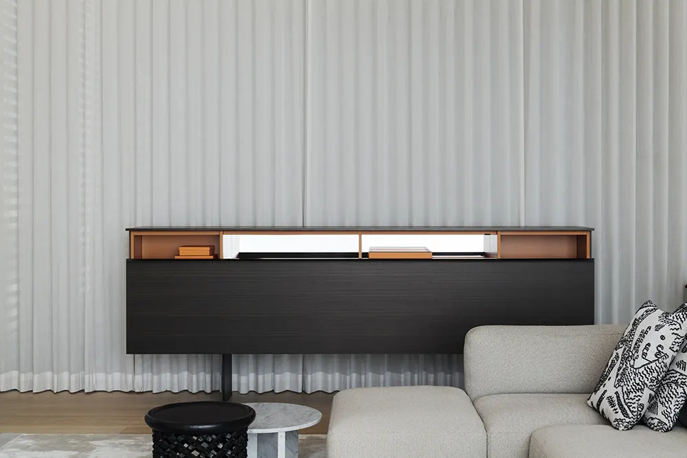 At Gaya Beach House in Mumbai, Porro enters a residence that already carries a strong architectural identity and answers it with furniture and storage systems that sharpen the house’s tone instead of softening it. The project sits on Juhu Beach, spans six floors, and comes from Lissoni Casal Ribeiro, who designed both the architecture and interiors for a home built around three generations of one family. The house also had to support official events, which gives the interiors a dual purpose from the start. Porro’s contribution works because it understands that balance. The pieces do not read as accessories dropped into finished rooms. They operate as part of the structure of daily life, moving between private ritual, hospitality, and display.