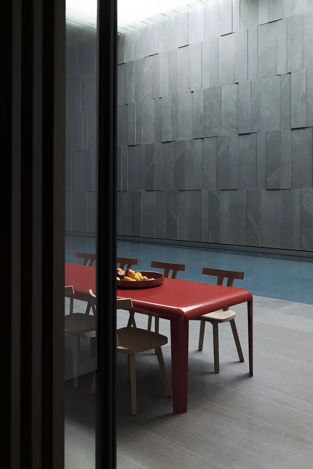 That control continues on the ground floor, where Frank armchairs surround a long custom table in the event dining room. Upholstered in bordeaux and dark orange, they introduce warmth but keep a rigorous outline through their shell-like backrests, metal structures, and padded seats. The room suggests one of the project’s strongest qualities. Gaya Beach House does not separate domestic life from representation. It accepts both and designs for both. Porro’s pieces support that condition well because they feel composed enough for formal gatherings yet still grounded in use. The brand’s presence across the house also avoids repetition by shifting material tone and spatial role from floor to floor. The same design language adapts, but it never turns static.