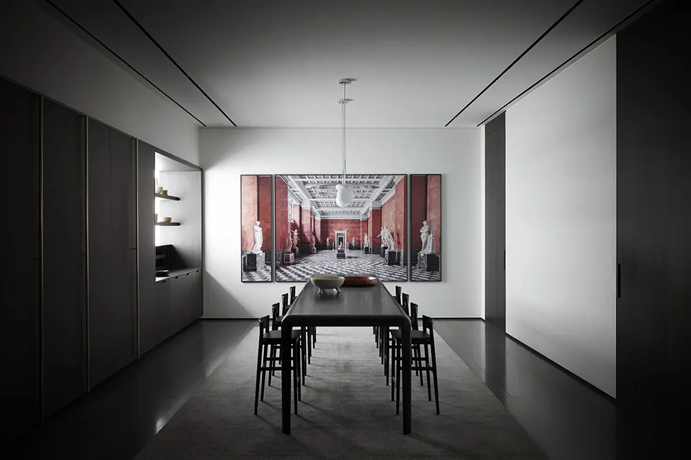 The architecture sets up that reading clearly. Recessed terraces and slit windows pull the exterior into view, while two monumental staircases organize the distinction between public and private zones. Within that framework, Porro places objects that respond to scale, geometry, and circulation. In the basement, a red lacquered Ferro table cuts through the grey architecture with a precise burst of color, its aerodynamic silhouette giving the room a sharper edge. In the dining and meeting area, a second Ferro table in black creates a more restrained presence beside Brina stools, whose tapered ash legs and curved backrests bring definition without heaviness. These early interventions establish the main rhythm of the house. Porro does not rely on visual excess here. It uses proportion, finish, and placement to hold tension inside rooms that already carry strong formal character.