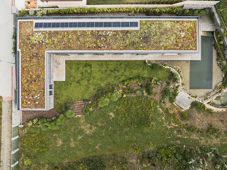 The house follows an L-shaped plan, taking advantage of the natural slope of the site. From the street, the building appears modest and closed, offering little to passersby and ensuring maximum privacy. Once inside, however, the spaces unfold toward the private garden, designed as a gentle ascent into the surrounding forest. The terraced terrain enriches the transition between the built and the natural, giving the garden a sense of continuity with the house while reinforcing its role as a private sanctuary.
