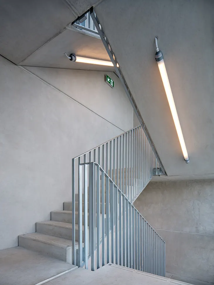 Construction follows a modular prefabricated system that combines timber and concrete. Walls and floor slabs are formed from CLT panels, assembled on-site to ensure precision and efficiency. The gallery structures use glued laminated timber, while concrete cores and external elements provide structural stability. This hybrid system supports both the architectural clarity of the project and its practical demands, maintaining a consistent material logic throughout.
