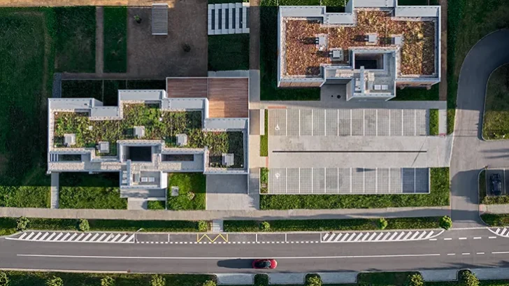 Environmental performance is embedded in the design through passive strategies. The compact mass reduces energy demand, while wooden shutters provide shading across the façades. Apartments achieve cross-ventilation through dual orientation, improving indoor conditions without reliance on mechanical systems. Vegetation appears across multiple levels, from roof surfaces to internal atria, reinforcing the integration of landscape into the residential fabric.