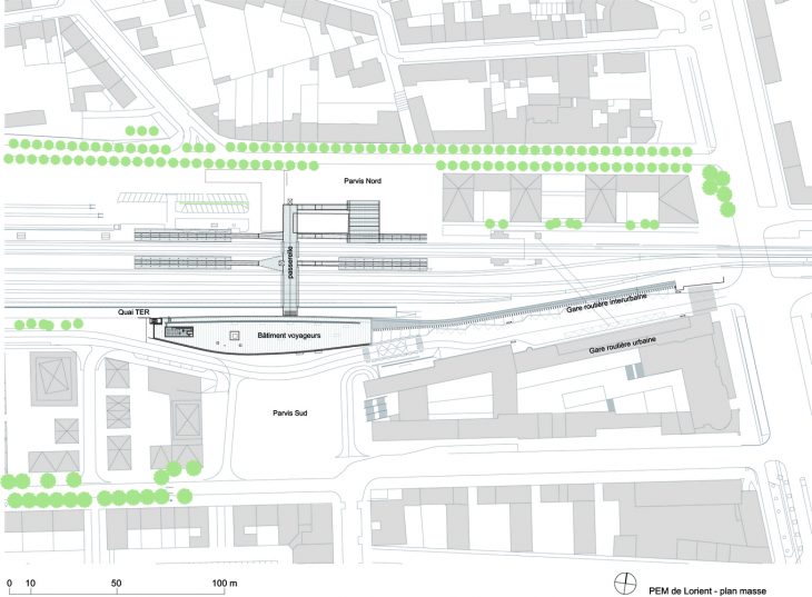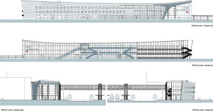 The Lorient multimodal hub is part of the “Bretagne à Grande Vitesse” project (“High-speed for Brittany”), a high-speed line which is expected to allow a three-hour total travel time between Quimper, Brest and Paris by 2017. The station is being rebuilt on the south, close to the city centre and in the heart of the transport hub accommodating different types of public transport means: rail, inter-city buses and coaches serving the conurbation. The north and south forecourts house taxi ranks and drop-off areas. Car parks and bike parking facilities will be incorporated in the neighbouring construction projects to come. An urban walkway both allows to access the platforms and links Kerentrech district to the city centre during the station opening hours.
