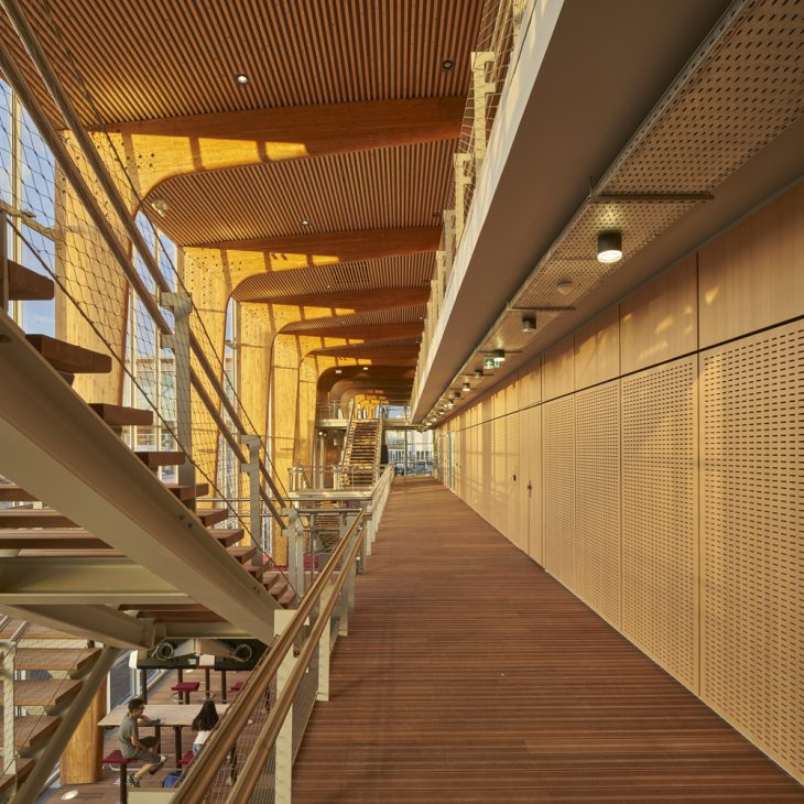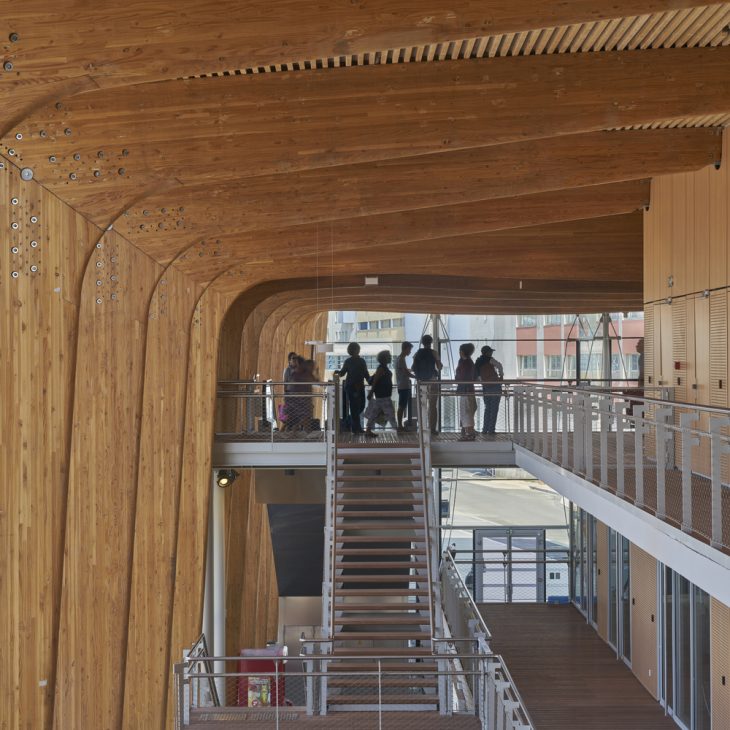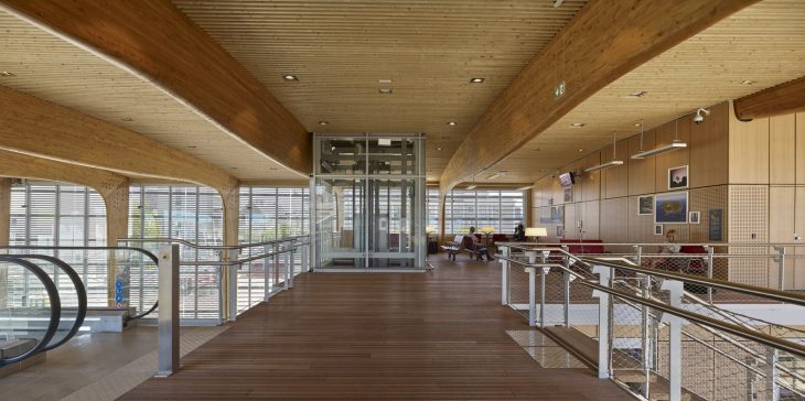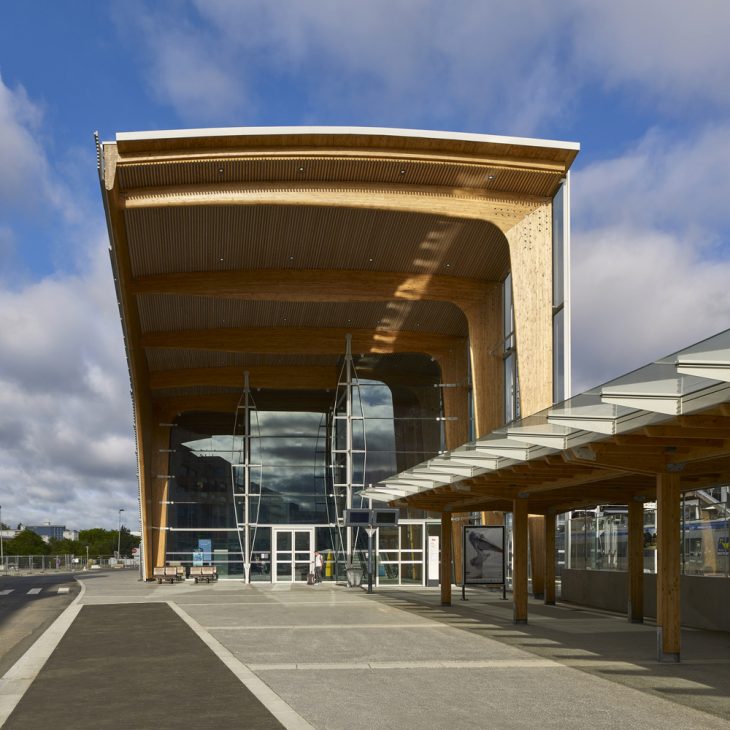 The main façade opens up to the heart of the city and along with the large timber portal frame forming the building’s structure, alludes to the city’s shipbuilding tradition. Lorient’s recent architectural history gives prominence to stone as well as concrete and washed-concrete façades, all of which is echoed by the fibre-reinforced double skin featuring all the openings related to the various elements of the project (station entrance, retail outlets, offices) and protecting the façade from solar radiation. Colour is a background element in the same way as in the buildings with loggias of Lorient. The south façade is composed of a complex timber structure comprising insulation, interior and exterior timber cladding, glazed surfaces and double skin, ultra-high performance concrete (UHPC) screen modelled in sub-frames. The north façade is mostly glazed and its large openings allow views on the new TER platform (express regional lines), the rail tracks, the future north access and the historic district of Kerentrech. It is gridded with large glass modules featuring metal crosspieces with a 4.80-metre span between the beams.