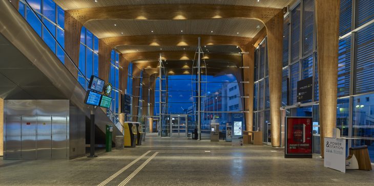 The structure of the passenger building consists of a series of portal frames made of composite wood and featuring various spans. The central part of the building is braced by a concrete core and the hall and canopy by concrete portal frames located in the area intended for operational purposes. The roof extends towards the coach station by means of a canopy, which is supported by a cantilevered beam running along its south edge and arching down to the ground.