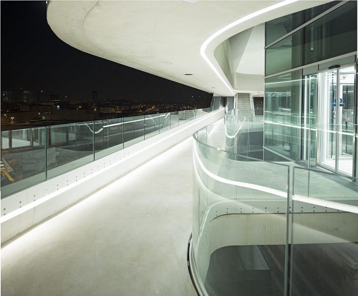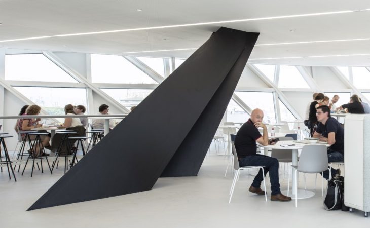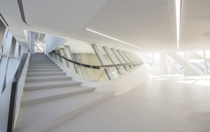 Surrounded by water, the new extension’s façade is a glazed surface that ripples like waves and reflects the changing tones and colours of the city’s sky. This perception of a transparent volume, cut to give the new building its sparkling appearance, reinterprets Antwerp’s moniker as the city of diamonds.