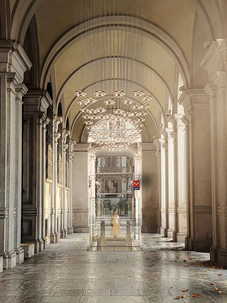 UNS grounds the design in Turin’s architectural contrasts. The city’s restrained exteriors and more layered interiors inform a sequence that moves from simplicity to richness. Station entrances adopt clear geometries that align with the city’s facades, while interior spaces introduce warmer materials and more expressive forms. This shift creates a legible transition between street and underground, reinforcing orientation while maintaining a sense of continuity.
