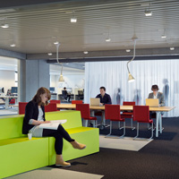 The main entrance of the building gives access to an open and welcoming lobby which has spectacular views into the park and connects via a generous stair to the park level below. The welcoming double height lobby space expresses the continuous interrelation with the surrounding park landscape and the other UN-buildings on the campus. For the campus landscape BARCODE worked together with West 8 Landscape Architects. West 8 designed a landscape concept which strengthens the character of the UN-Campus as a coherent working environment and beautiful green oase along the Rhein. The park landscape strengthens the qualities of the office design and invites for exchange and communications between the UN employees of the different departments.