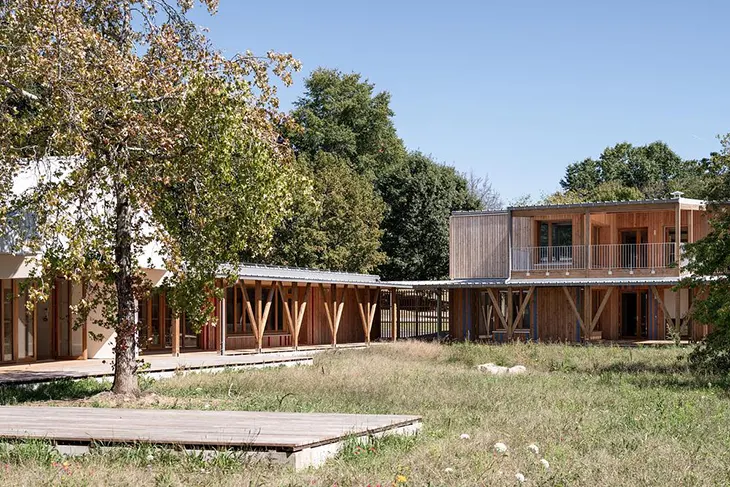 Set within a three-hectare former campsite near Limoges, the Leisure Centre with Dormitory represents a carefully calibrated response to landscape, childhood, and environmental responsibility. Designed by Atelier Quatre in collaboration with r2k architectes, the project transforms an underused site surrounded by remarkable trees into a year-round destination for leisure, learning, and overnight stays for up to 200 children.