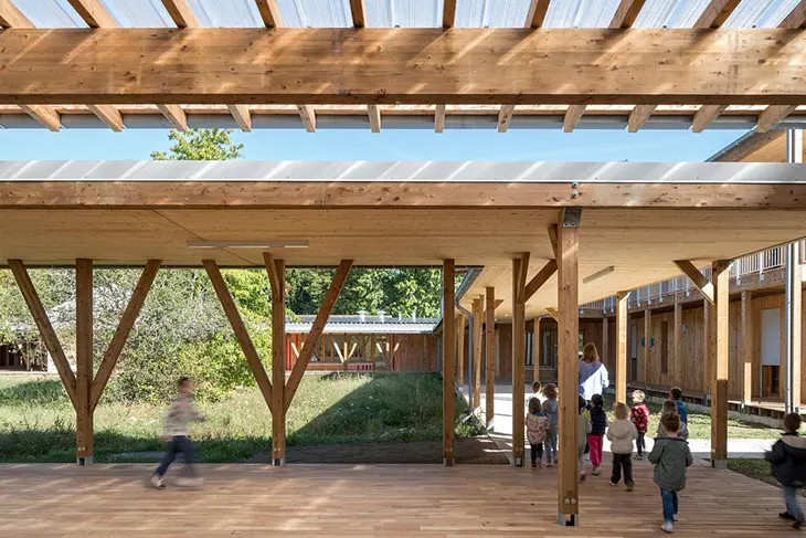 Arrival unfolds through a porch that opens onto a central lawn, the heart of the complex. A wooden gallery runs along this meadow, connecting all functions and establishing a clear, legible circulation system. This covered walkway becomes an architectural spine, guiding children from shared outdoor space toward reception, administration, activity rooms, accommodations, catering facilities, and kitchens. The experience remains reassuring and intuitive, reinforcing orientation through repetition and rhythm.