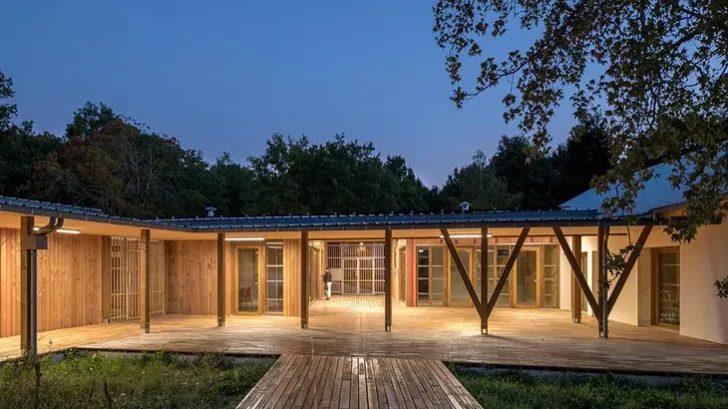 Set within a three-hectare former campsite near Limoges, the Leisure Centre with Dormitory represents a carefully calibrated response to landscape, childhood, and environmental responsibility. Designed by Atelier Quatre in collaboration with r2k architectes, the project transforms an underused site surrounded by remarkable trees into a year-round destination for leisure, learning, and overnight stays for up to 200 children.