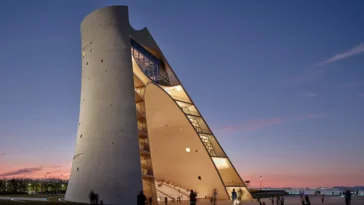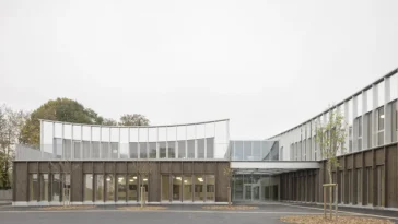 Emmanuelle Moureaux Architecture + Design designed this impressive bank. The site is located on the corner of major intersection, where there is a frequent movement of cars, bicycles and people. Taking this unique location as a characteristic, the facade is designed to be rhythmical that changes expression as people see from different angles. Colors appear in and out from the rhythmical repetition of cubes, dancing like musical notes playing rainbow melody. The facade is composed of cubes of four different depths. Small elevated gardens are built inside 12 cubes, where the seasonal changes in nature are expressed by seasonal flowers like marigold, lavender, and growing trees such as olive tree. Gardens can be seen from the open space on the first floor, and from the financing section and cafeteria on the second floor. Sunlight is filtered through the foliage of elevated gardens on the South facing facade, providing a harmonious and warm atmosphere inside the bank. The colors, flowers and trees appear in and out from the repetition of floating cubes, playing rainbow melody. The melody spreads happiness and comfort to visitors and to the people in the local community.