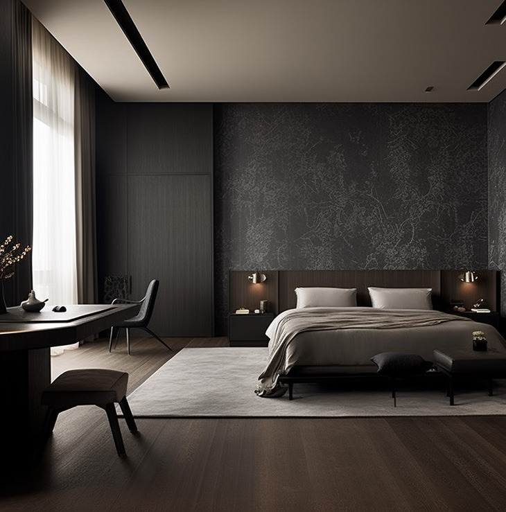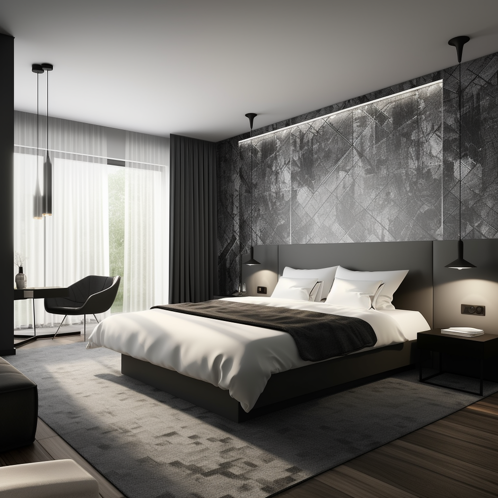 Images above feature solutions rendered by ARCHISCENE’s interior design editors, and present use of such a wallpaper in a contemporary hotel room.