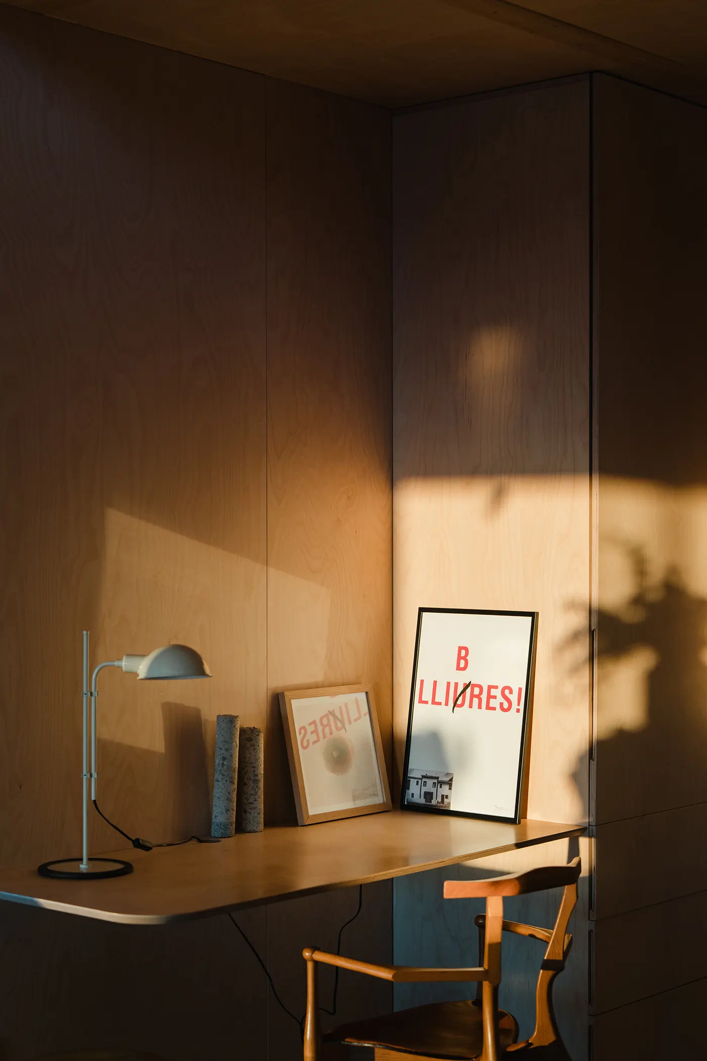 The furnishings reinforce the project’s commitment to craft and regional identity. Chairs, stools, and armchairs come from Vergés Design. The Formentor armchair by Blasco&Vila and the Maca hammock by Calma Outdoor furnish the living spaces. Lighting includes pieces from Santa & Cole (Cesta, Disa, and TMM lamps), a small linden and alabaster lamp by Siete Formas, a kitchen bar lamp from IHI Studio, and a wooden bedside lamp by Alex Mestre. The Funículi lamp by Marset and the EK61 by Carl Hansen & Søn complete the selection. Faucets throughout are from Icónico, with switches by JUNG.