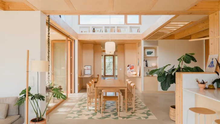 The project emerged from circumstance as much as intention. Crous’s partner Carles, who works in digital fabrication with wood and plastic, comes from a local farming family with access to machinery capable of handling large-scale materials. This practical advantage shaped the entire approach: Casa al Pradet was conceived from the outset as a self-construction project, with design, technical resources, and timelines woven together from the first sketch.