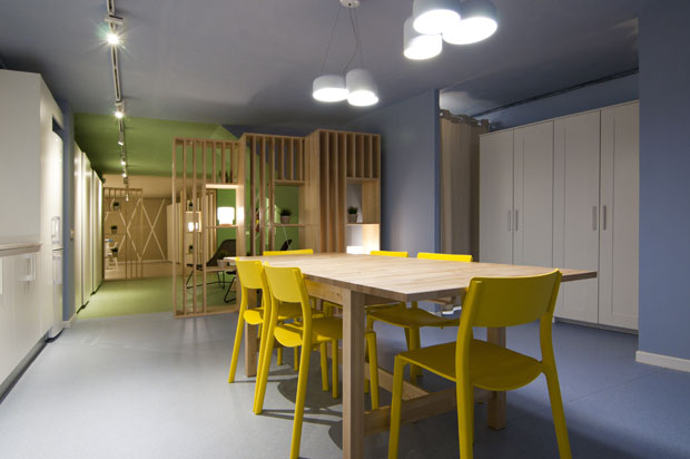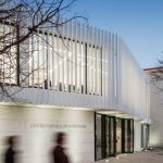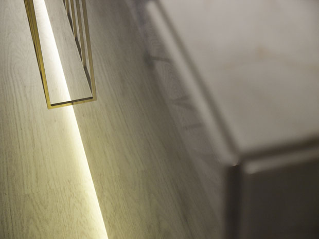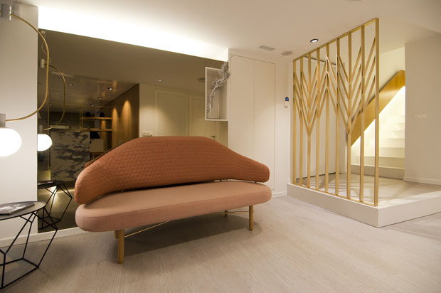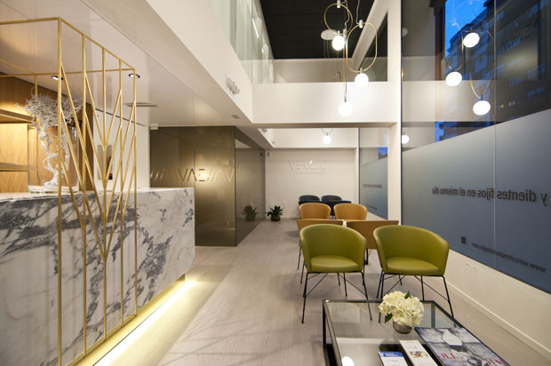 A pioneering medical center with reference professionals in the field of dental implantology. The renovation affected the whole of the three floors with a total area of about 300 m2 that had previously been a dental clinic. The company required a quick and contained renovation that used the preexisting as much as possible. The design of the facade is a clear example of a cosmetic solution. The corner where is located the entrance to the clinic and part of the main facade are covered with a skin of aluminum panel ventilated copper-finished by Dibond that regularize and emphasize the height. The project aims to avoid the cold and aseptic sensations, which are usual in this type of clinics. User experience is taken care extremely, transmitting comfort, closeness and confidence. The concepts of “excellence” and “passion” are valued as essential qualities of a brand that provides an exquisite treatment and an extreme attention to detail in order to achieve excellence. Under these premises, a cozy and atypical space has been designed. The goal is to get the user to disconnect, feel comfortable and cared, relaxed in a calm and suggestive atmosphere. The main access area is a double height space where the lobby, reception and waiting area are located. It is a bright space, open to the outside by the windows of the facade, whose protagonist is the reception, as a large cubic volume covered with marble that has been specifically designed for this space. The entrance area reminds a lobby hotel with a Simone sofa by Missana and several Moon chairs by Capdell in different finishes in the waiting area. – from Estudio Vitale