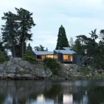 At the center of the layout, a communal area opens toward views of the neighboring park. Around this core, three enclosed workspaces, referred to as small houses, provide settings that cater to different work styles and privacy requirements. The design team used a palette that shifts from soft neutral tones to a saturated cobalt blue, giving each workspace a distinct identity while maintaining a consistent visual rhythm throughout the office.