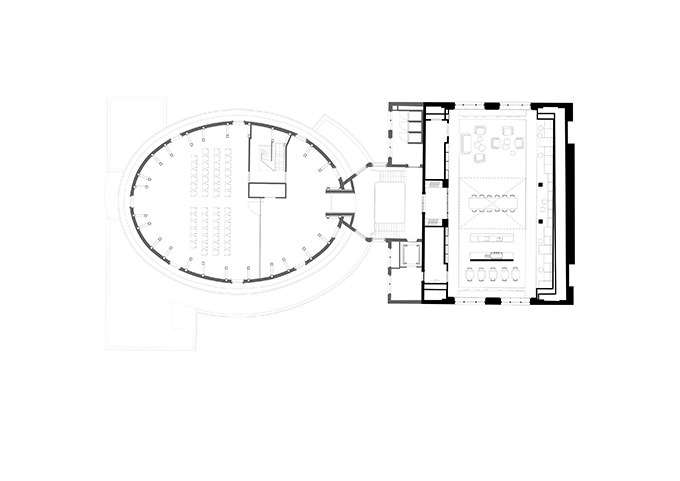 The Concert Hall, famousf or acoustic concerts, is finished in original color schemes which regained a classical appearance. Large steel chandeliers and acoustic wall cabinets places the interior in the present at the same time. Flexible wall units can be opened or closed for sound absorption or reflection, and now make both acoustic and electronic music possible. They also provide in technical, light and sound facilities. Both a classical concert and a house party are now possible, as the building must ultimately be a vibrant culture house for both the young and the old.