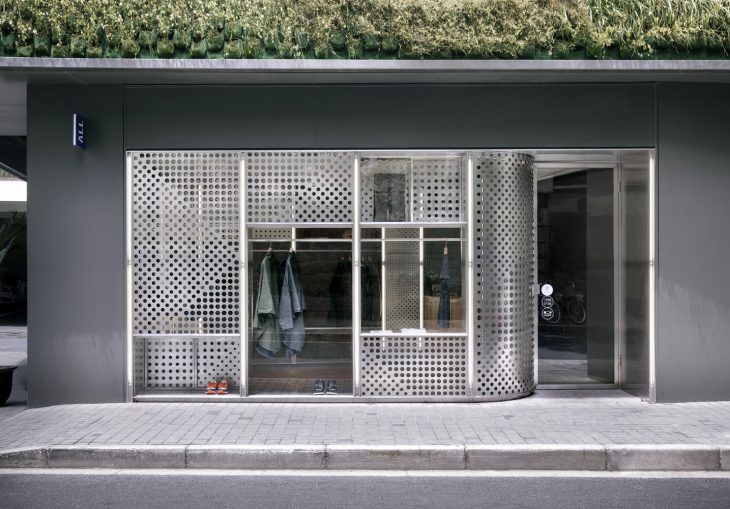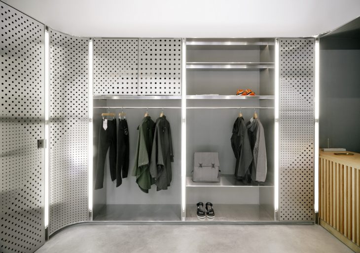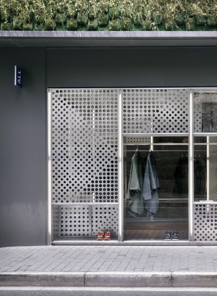Responding to the urban nature of the store location, Linehouse created a curved stainless steel installation which operates as a retail system on the interior, as well as a dynamic façade treatment. Perforated stainless steel panels with a graphical treatment of varying punctures and patterns were inserted, shifting between the inside and outside and creating pockets of the retail display either facing out onto the street or into the store.