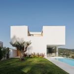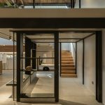 Apart from the concrete façade we described earlier, the entrance vestibule marking the main entrance of the building and first floor balcony are clad with wood to contrast the black concrete surfaces. Wooden windows and doors also bring warmth to the exterior of the building.