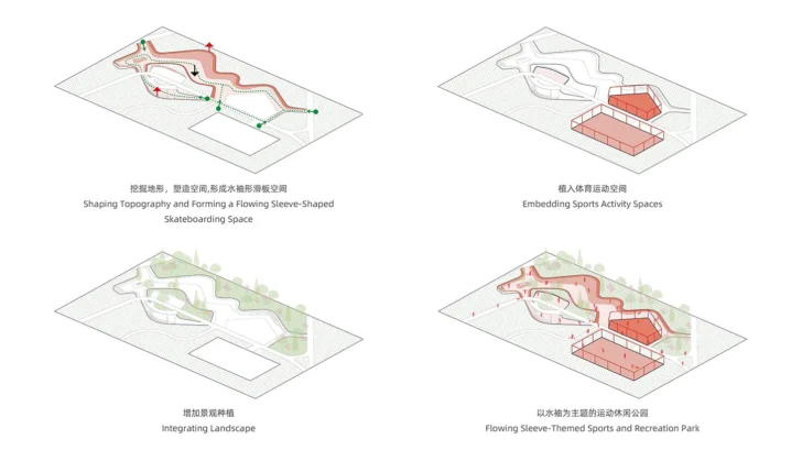 Drawing on the lyrical imagery of Kunqu, one of China’s oldest operatic forms, the design by SoBA (Soft Build Architects) reimagines the iconic water sleeves as spatial gestures. The park’s terrain undulates with abstracted forms that echo the billowing sleeves, translating centuries-old choreography into concrete and greenery. This narrative-driven approach anchors the park in local identity, while fostering a sense of discovery and belonging for all who enter.