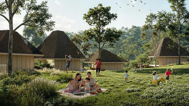 Before any construction decisions, the team documented existing conditions in detail. More than 350 native trees were mapped and preserved, and circulation routes weave carefully around them to maintain canopy continuity and ecological connections. Of the total land area, 73 percent remains unbuilt, reserved for forest buffers, ecological corridors, and productive farmland. These areas continue to operate as living infrastructure, supporting biodiversity, food production, and long-term resilience.