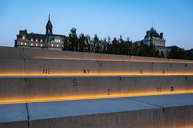 The memorial dimension extends into the surrounding urban fabric. The project establishes visual connections with La verrière, the stained glass installation by artist Marcelle Ferron that covers three facades of the nearby Champ-de-Mars metro station. The plaza also relates to Place Marie-Josèphe-Angélique, redesigned in 2025 as part of the broader intervention.