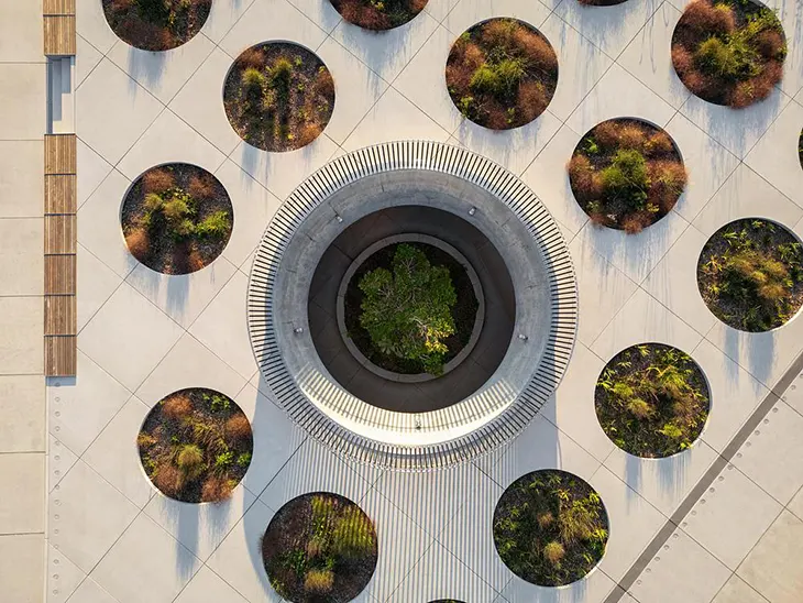 An urban forest planted to the north of the plaza demonstrates the project’s ecological strategy. Designers introduced trees above railway tunnels and dense infrastructure while selecting species suited to shallow soil depths. Through this approach more than half of the site now supports vegetation.