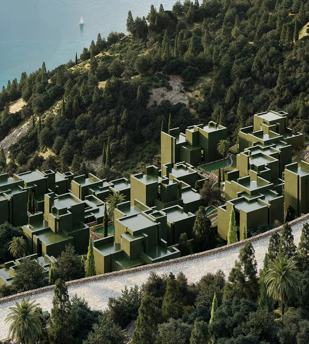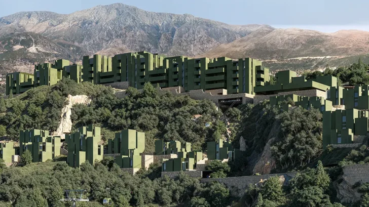 The Veil introduces a large residential program into the forested coastline of Dhërmi, where development has remained limited due to steep terrain and dense vegetation. Bofill Taller de Arquitectura approaches the site with a distributed strategy that avoids concentration. Instead of consolidating volume, the project disperses 366 apartments and 77 villas across two plots, organizing them into sixteen typologies that align with the natural contours.